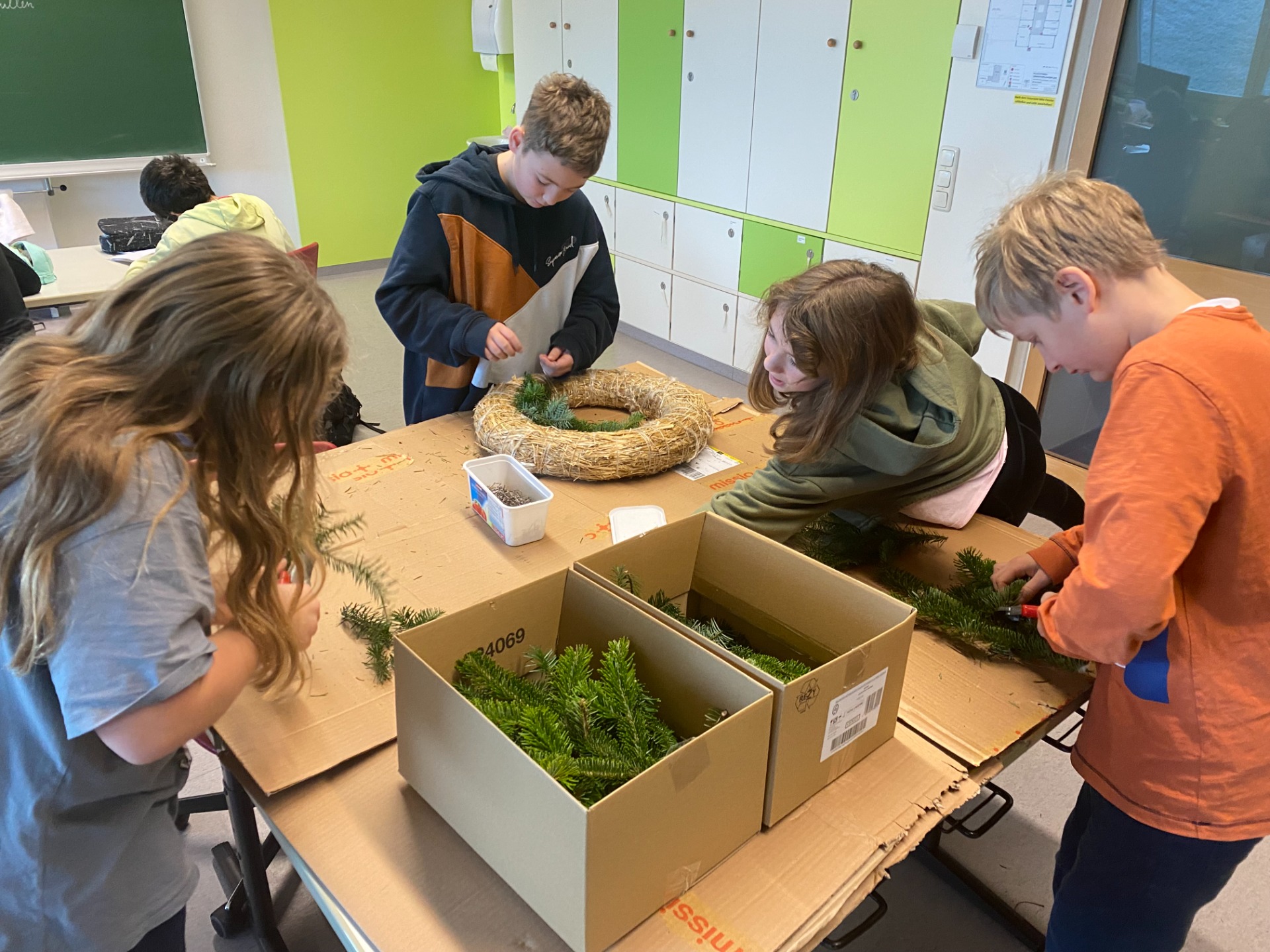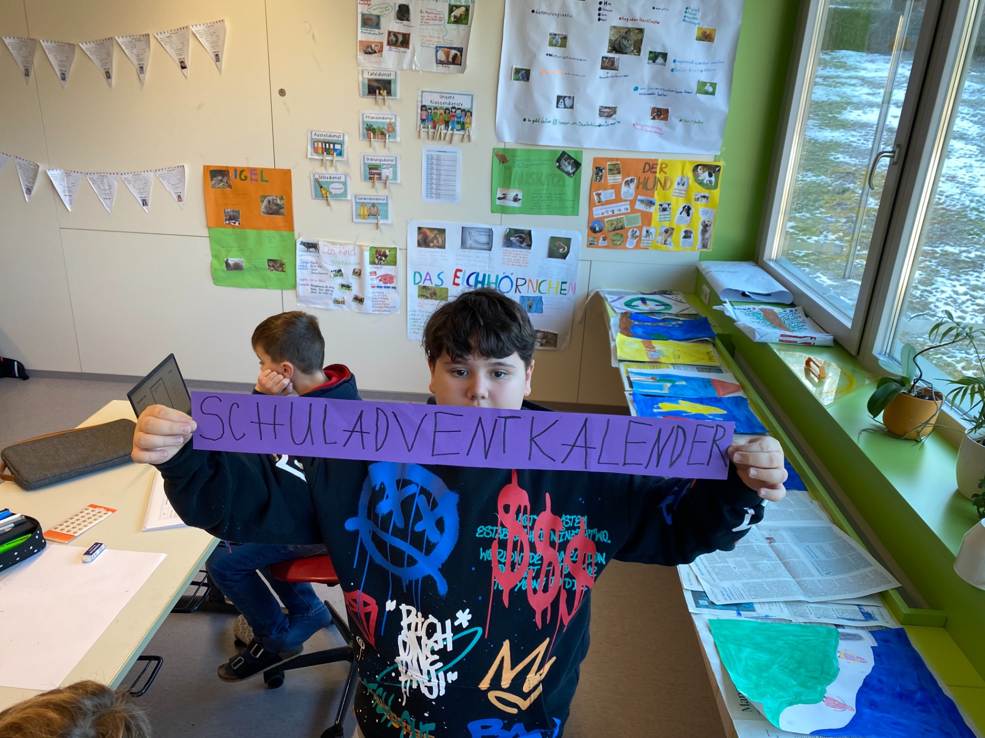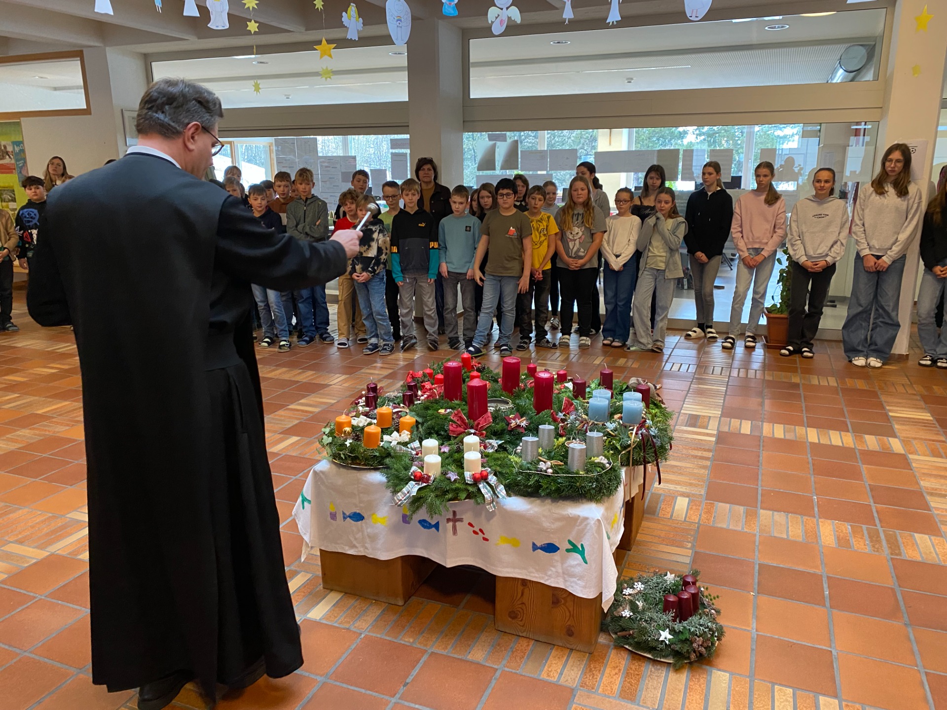 Advent ist eine Zeit der Ruhe und Besinnung, eine Zeit des Umkehrens und eine Zeit der Vorbereitung auf Weihnachten. Das merkt man auch bei uns in der Schule. Die ersten Klassen haben den großen Adventkranz für unsere Schule selbst gebunden und einen Schuladventkalender mit passenden Bildern gestaltet. An jedem Schultag wird jetzt von einigen Schülern ein „neues Fenster am Schulportal geöffnet“. Die Schüler der 2. Klassen haben Engel für den Schmuck in der Aula gezeichnet. Pater Jacobus hat uns in der Schule besucht und die Adventkränze gesegnet. Jede Woche versammelt sich nun die ganze Schule um den Schuladventkranz zu einer von den Kindern gestalteten kurzen Adventfeier. In den Religionsstunden haben wir in einer besinnlichen Bußfeier überlegt, was wir an uns selbst ändern wollen, damit wir zum Frieden beitragen. Am 23. Dezember werden wir um 12:00 in der Kirche gemeinsam die Heilige Messe feiern, zu der auch alle Eltern und Bekannten herzlich eingeladen sind.