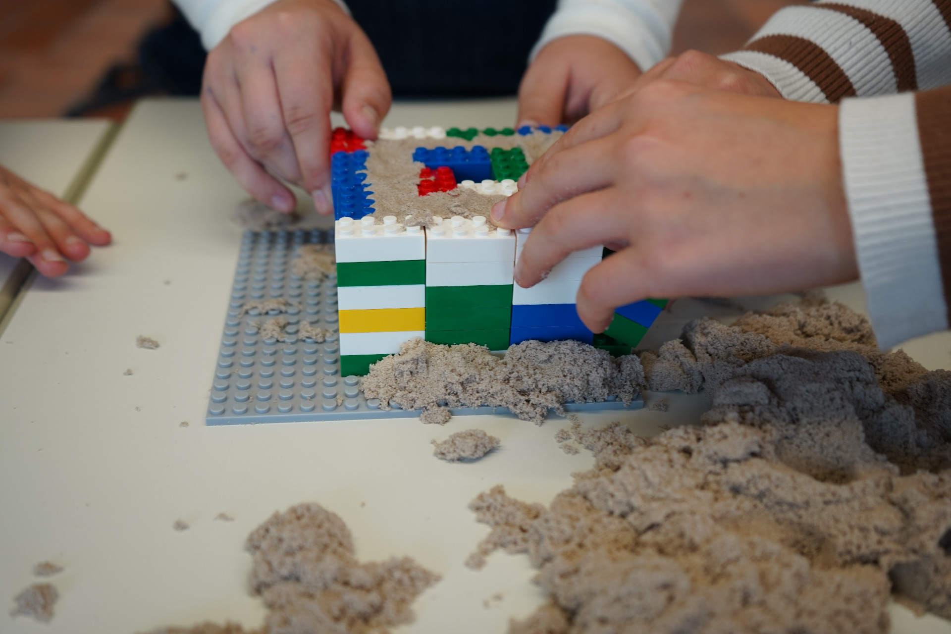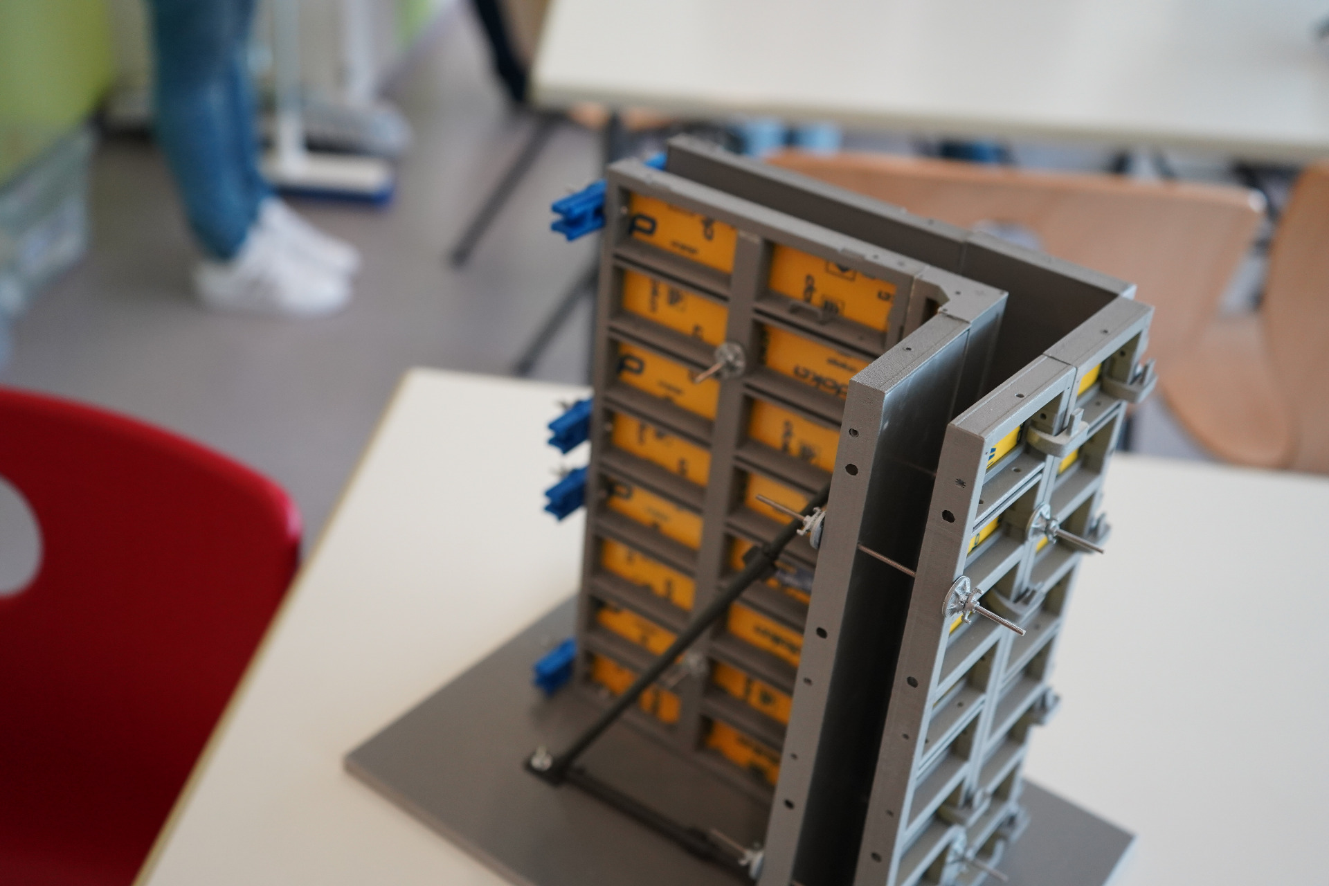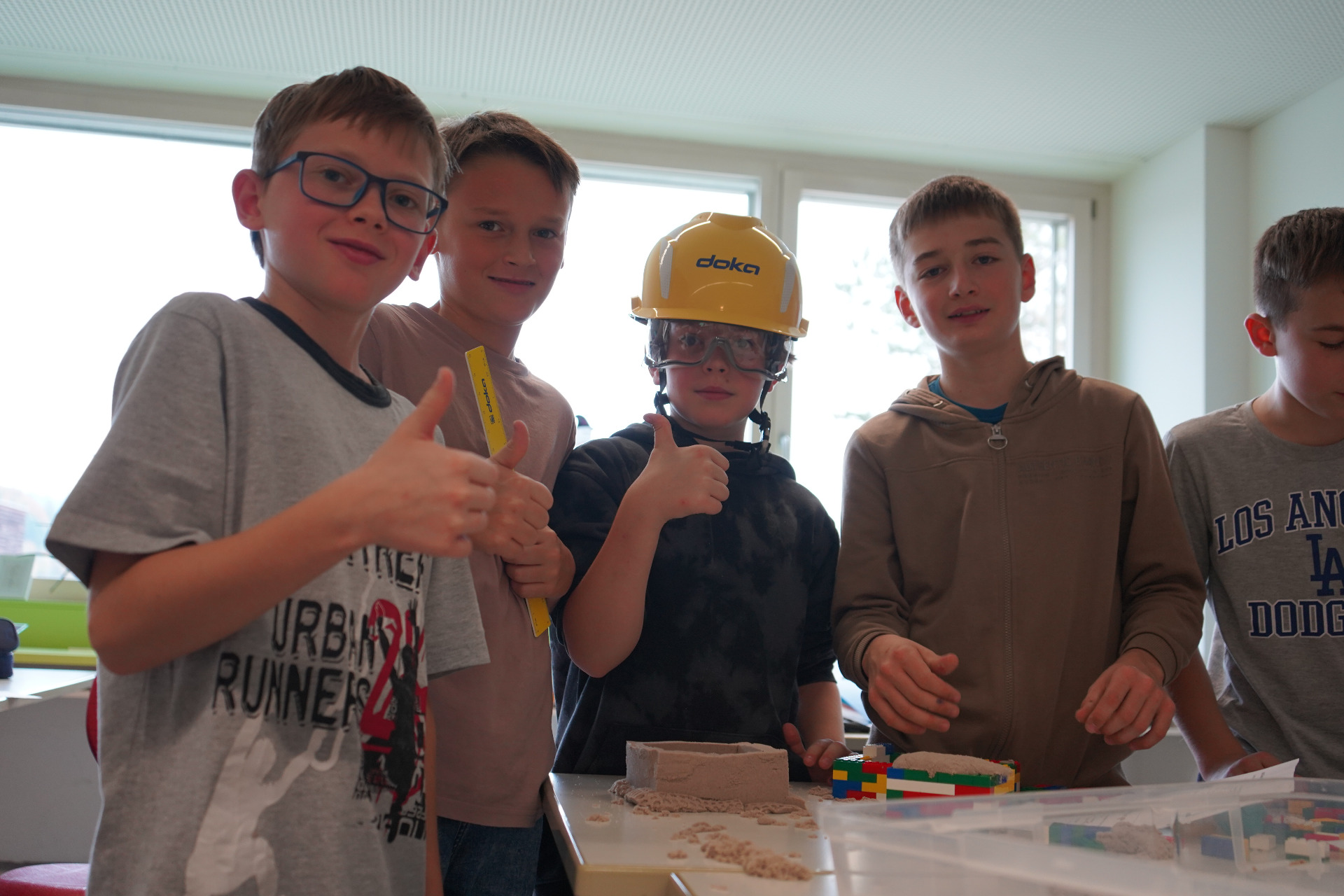 Zu Beginn stellten sich die Vertreterinnen und Vertreter des Unternehmens den Schülerinnen und Schülern vor. Anschließend durften die Kinder in kleinen Gruppen gemeinsam mit ihren „Role Models“ aktiv werden: Mit magnetic sand versuchten sie zunächst, eine Mauer zu errichten, bevor sie mit LEGO-Steinen eine Schalung für den Sand bauten. Beim anschließenden Vergleich erlebten sie spielerisch und ganz „hands-on“, was Schalungen sind und warum sie in der Baupraxis so wichtig sind.