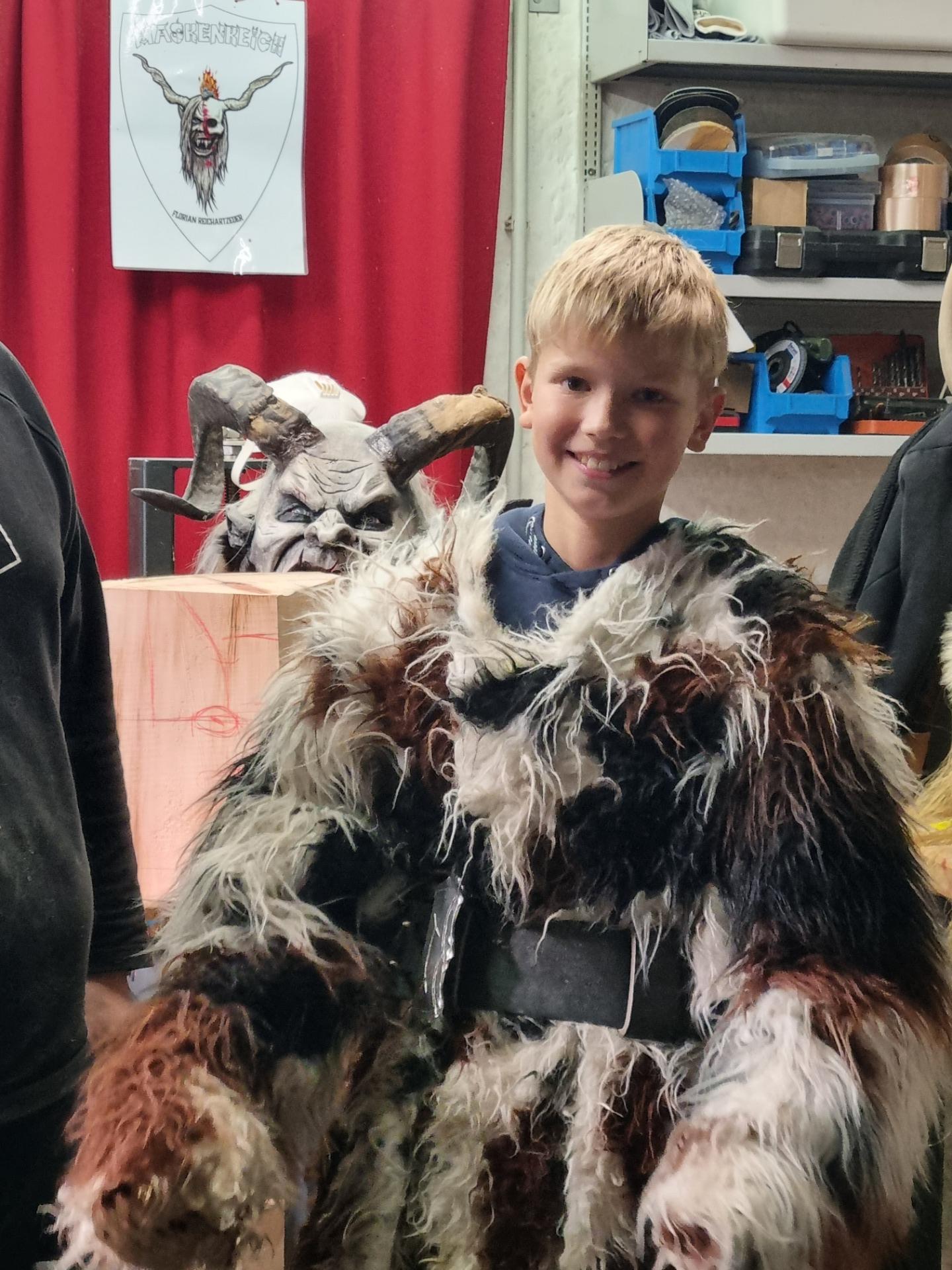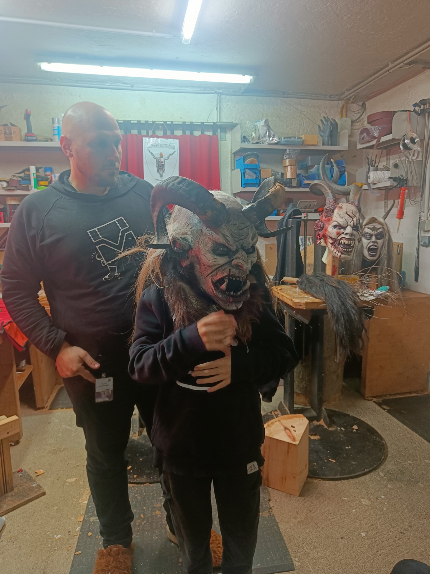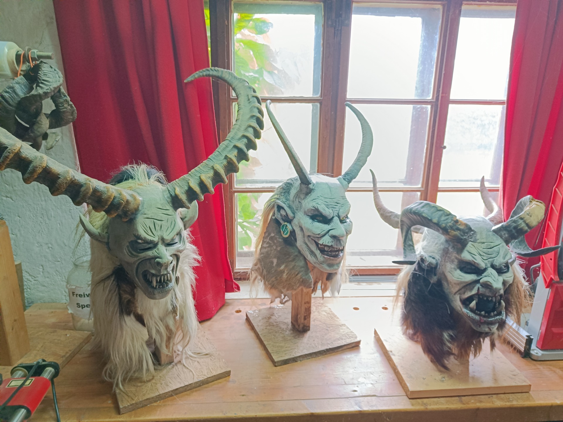 Spannend und detailreich wurde der Weg vom Zirbenholz zur Perchtenmaske erklärt. In sicherer Umgebung waren auch einige Mutige dabei, welche die schaurigen Masken anprobierten.